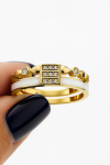 Delikatna obrączka współgra z dekoracyjnym frontem, tworząc spójną, estetyczną całość, idealną dla osób ceniących wyjątkowe, kolorowe akcenty w klasycznej złotej