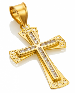 Krzyż przestrzenny z białymi kamieniami złoto 585