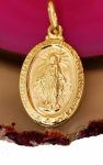 Centralny element przedstawia wizerunek Matki Boskiej Niepokalanego Poczęcia, symbolizujący ochronę i duchowe znaczenie medalika.